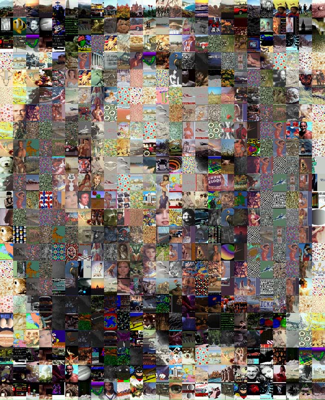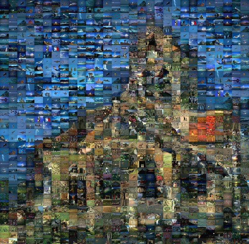 Small mosaics with a limited number of cells and absolutely no color correction. These are nice photo mosaic by themselves and a great illustration of our software abilities. When you have a lot of tiles in the mosaic library, Mazaika selects the most suitable pictures to assemble amazing compositions. See truest photo mosaic example below!