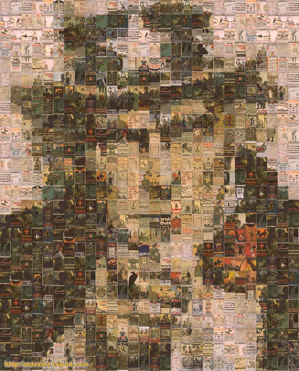 The Uncle Sam poster (28 x 25 cells) was made from the collection of about 700 old WWI posters. frequent repetition of tiles was allowed (every 4th tile, horizontal or vertical, can be repeated) so overall image is quite clear and detailed.