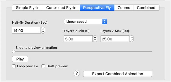 Speed - Here you may select the relative speed of the camera. Linear means constant speed. Fast-Slow-Fast - means fast initial camera movement that slows down when the camera shows mosaic, and faster movement when the camera goes to the side. Slow-Fast-Slow - full mosaic will be viewed at the fastest speed.